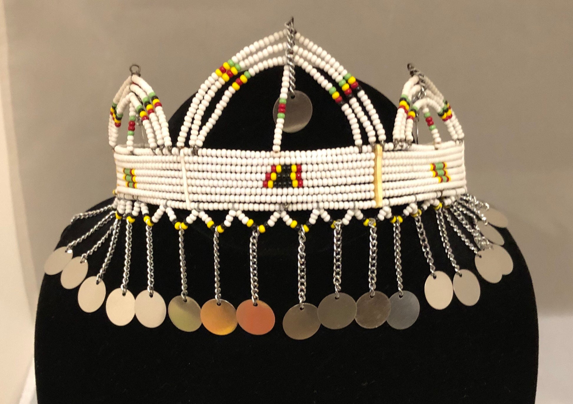 This hand beaded crown features white beads accentuated by red, green, yellow and black beads. button as additional decoration. This is a crown perfect for special occasions, spiritual ceremonies, religious occasions, etc. The bottom of this crown features black, yellow and white beads and a row underneath of beads, arranged in triangles, with metal tassels as well.