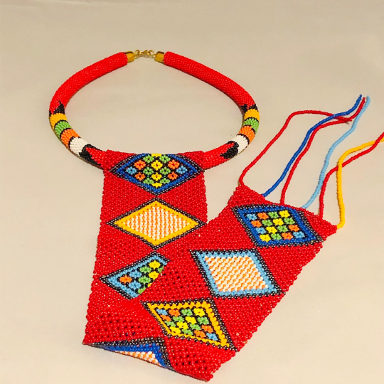 Absolutely gorgeous red, vibrant South African Beaded Necklace. Rich in traditional and cultural meaning. There is meaning behind the colors and shapes of jewelry. Typically, older sisters pass down the tradition to their younger sisters. Although men are not involved in making bead jewelry, they do wear beads. Zulu beadwork conveys communication between the sexes as it relates to relationships; design and colors combined convey a message.