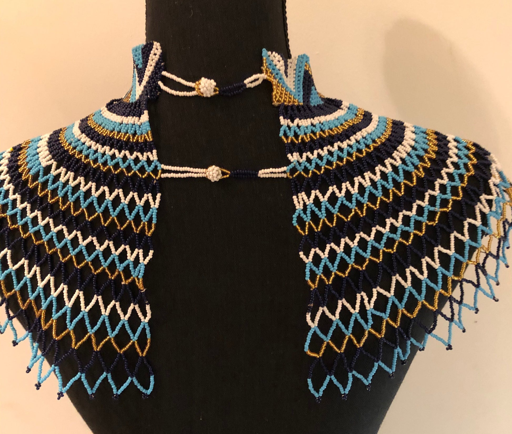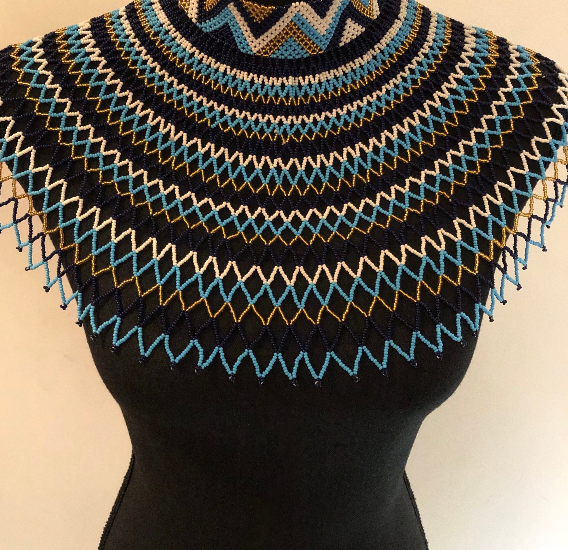 Sheba Shoulder Necklace, Blue and Gold | Handcrafted African Beaded Shoulder Necklace | Tribal & Ethnic | Afrocentric