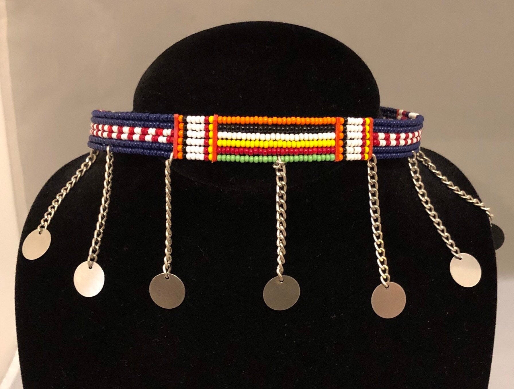 This lovely, colorful piece features a slim design and closes with a tie. The tassels make the piece even more elegant, yet playful enough for a more casual look. Available in multiple colors. For a more festive look, pair with Maasai earrings and bracelets.