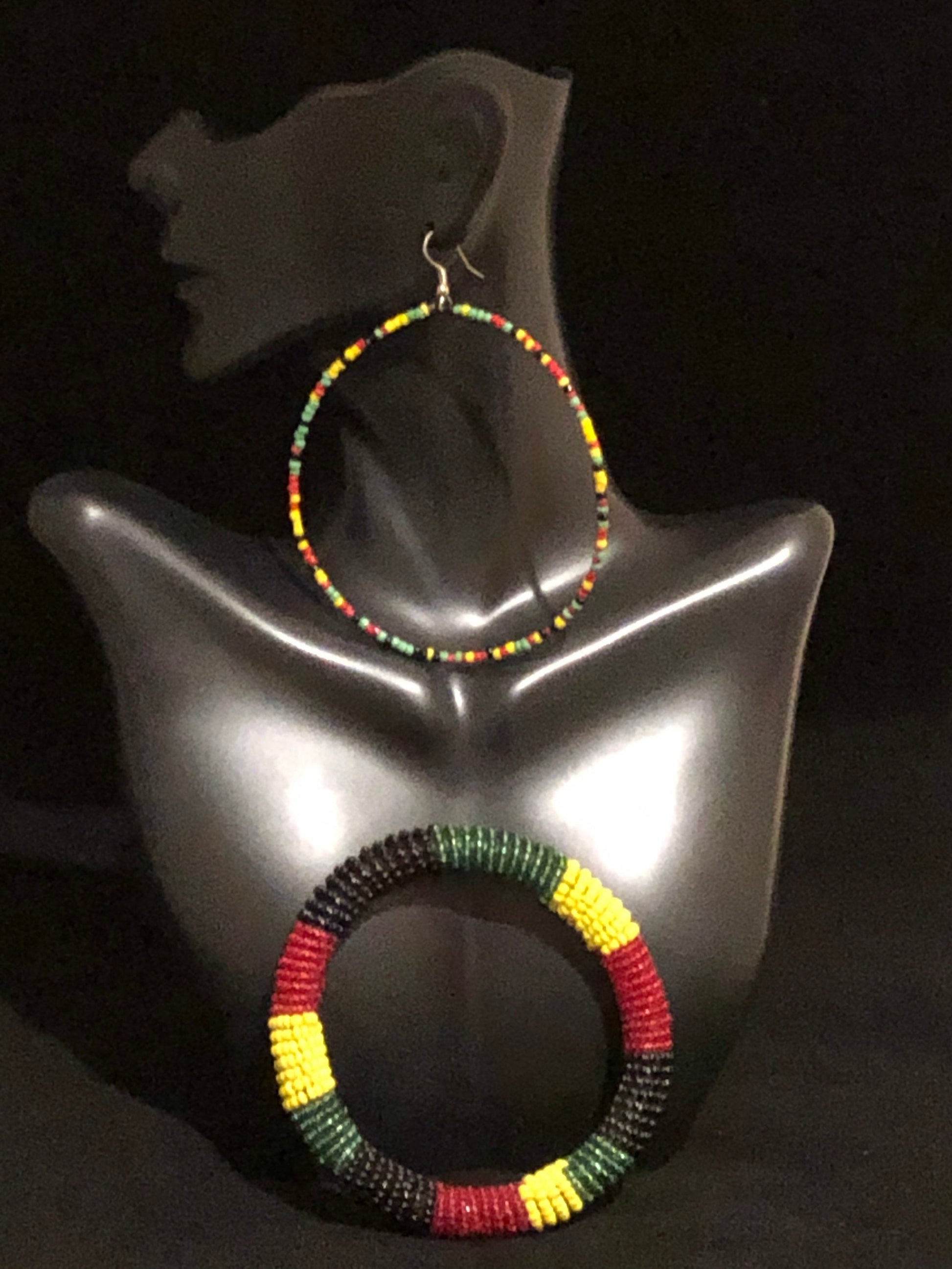 This is a hand beaded Maasai beaded bracelet, fashioned with Rasta colors. The colors red, black, yellow, green and black embody Rastafarian culture. Pairs beautifully with our Senegalese Cowry Shell Rasta necklace. Stack with other bracelets and rock the culture! Colors may vary from photo.